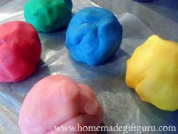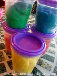 Tips: After you make the play dough, wrap tightly in clear or colored plastic wrap or use an air tight Tupperware or Ball plastic freezer jars. It is also a nice touch to attach the play dough recipe and instructions you used, so the family can make more if they want.
