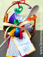 You could also put together a homemade gift basket play dough recipe mix kit as shown to the right. This play dough kit has play dough mix with coloring, ball plastic storage jars for storing prepared play dough, a wooden spoon for stirring, instructions and play dough shape cutters throughout.